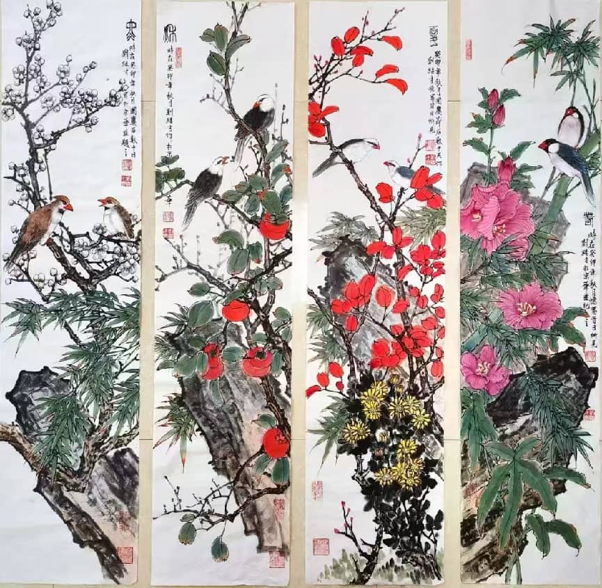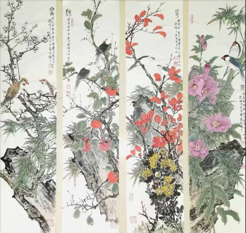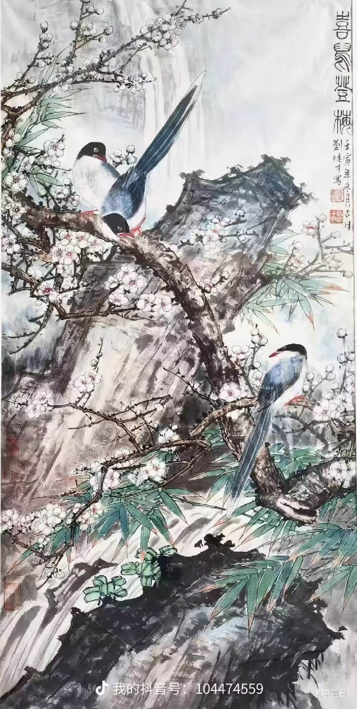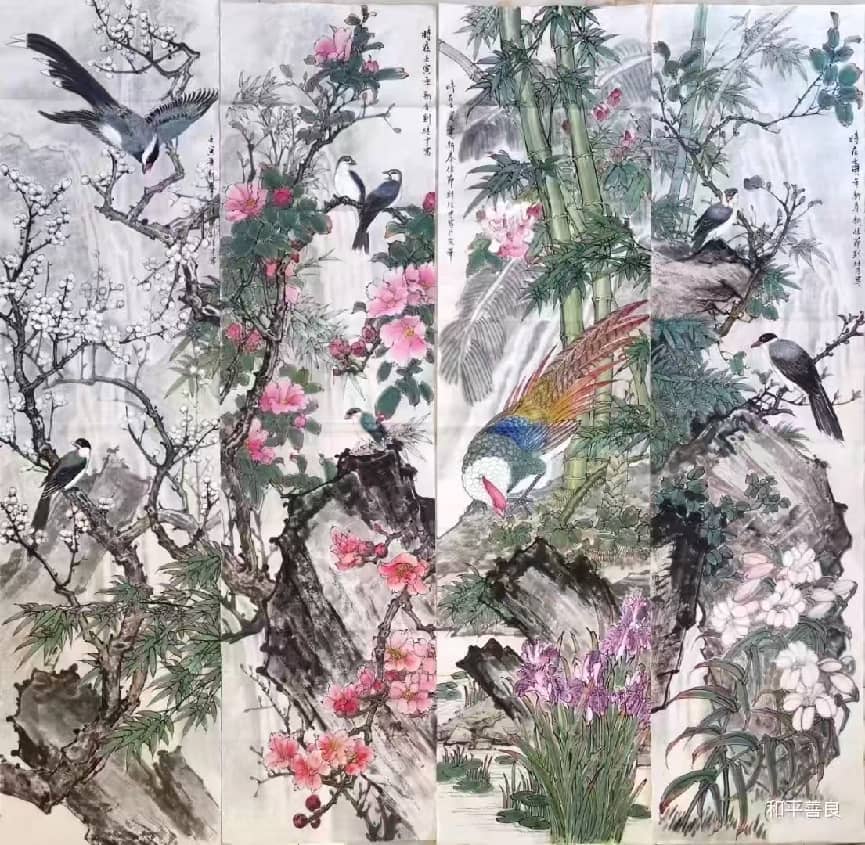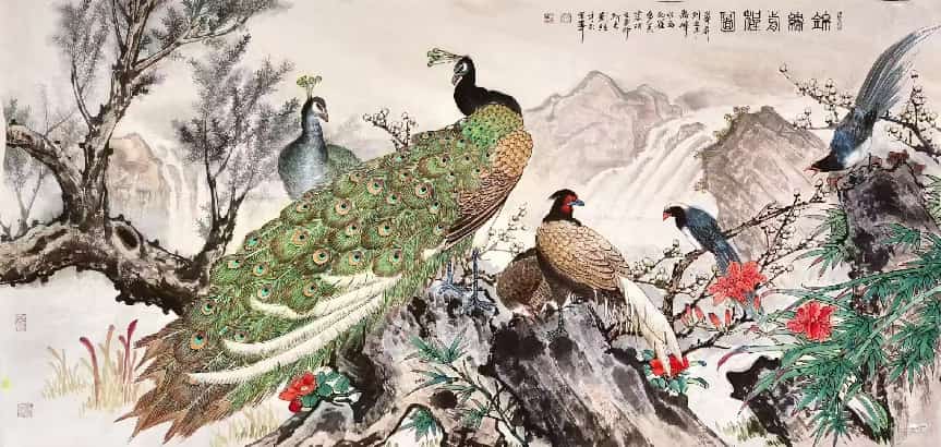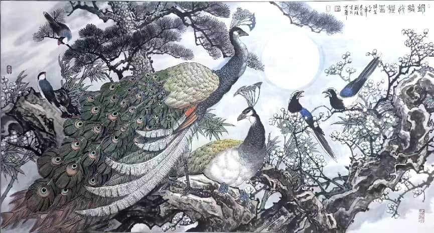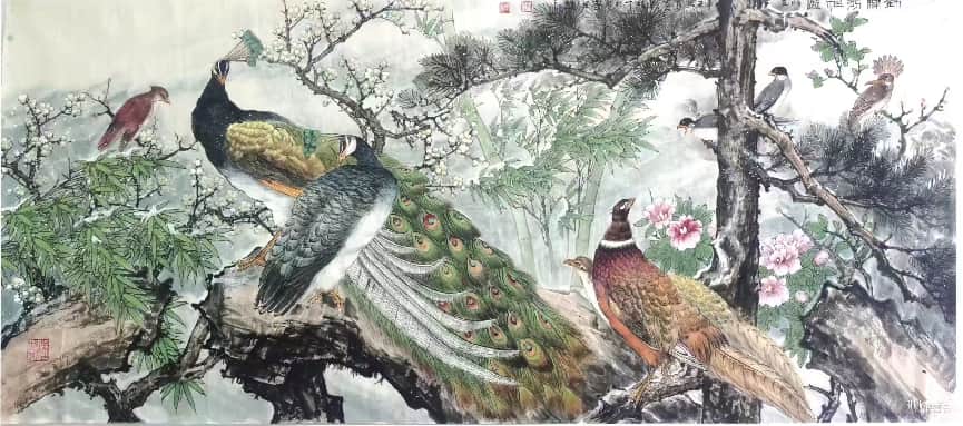 2. 花鸟:工细传神,尤善孔雀,造型精准、色彩富丽;笔墨秀润中见苍劲,意境典雅,兼具富贵气象与文人意趣。