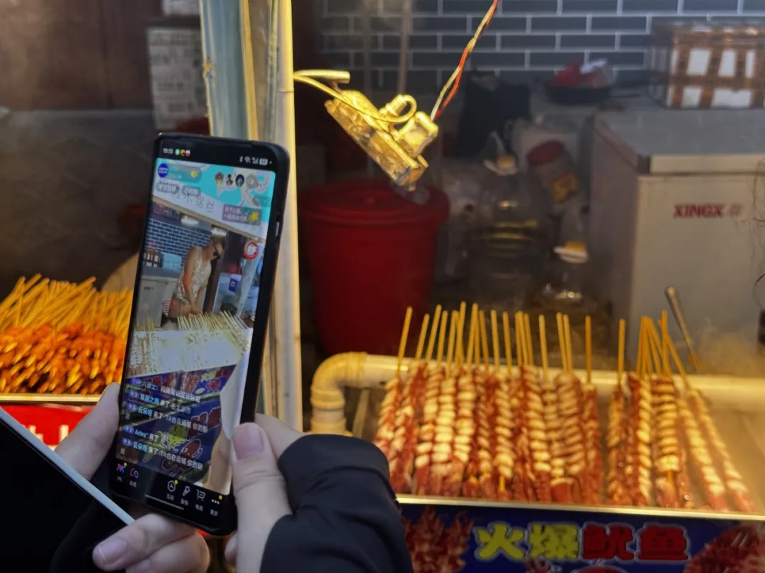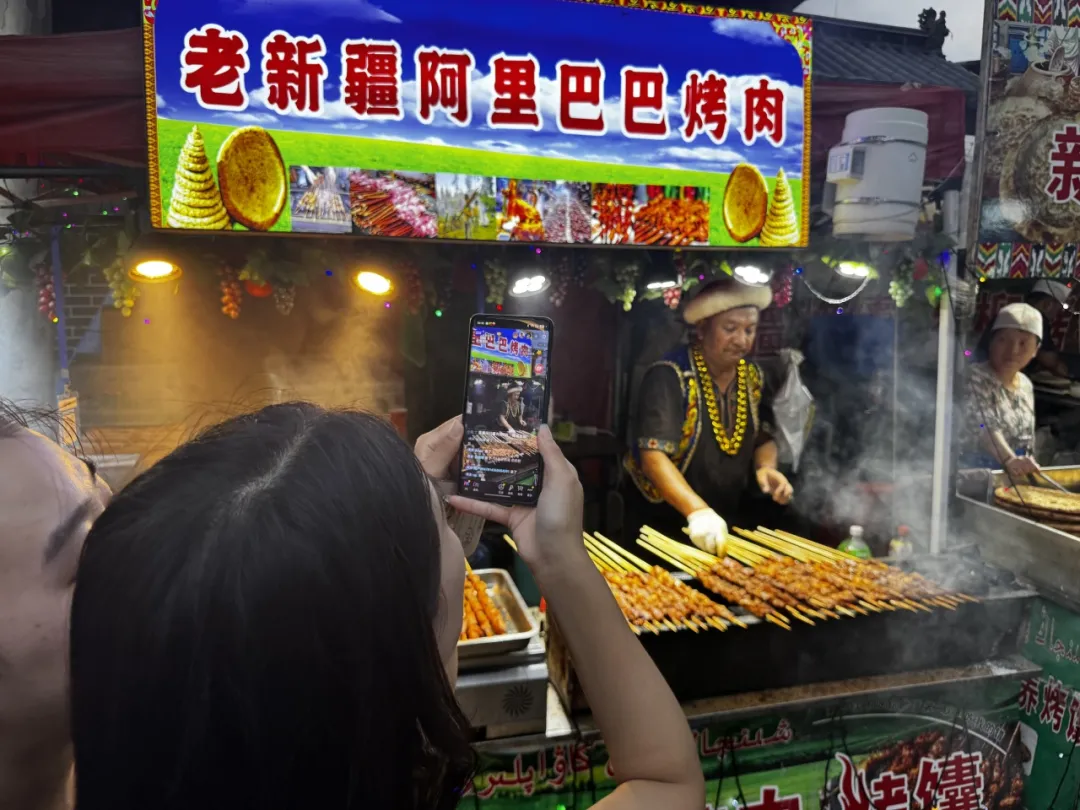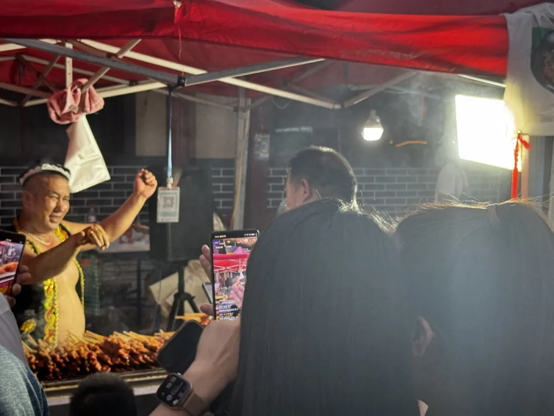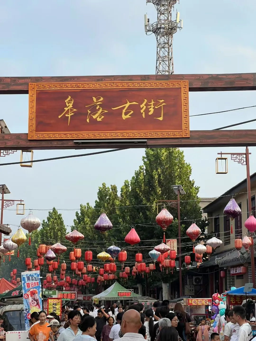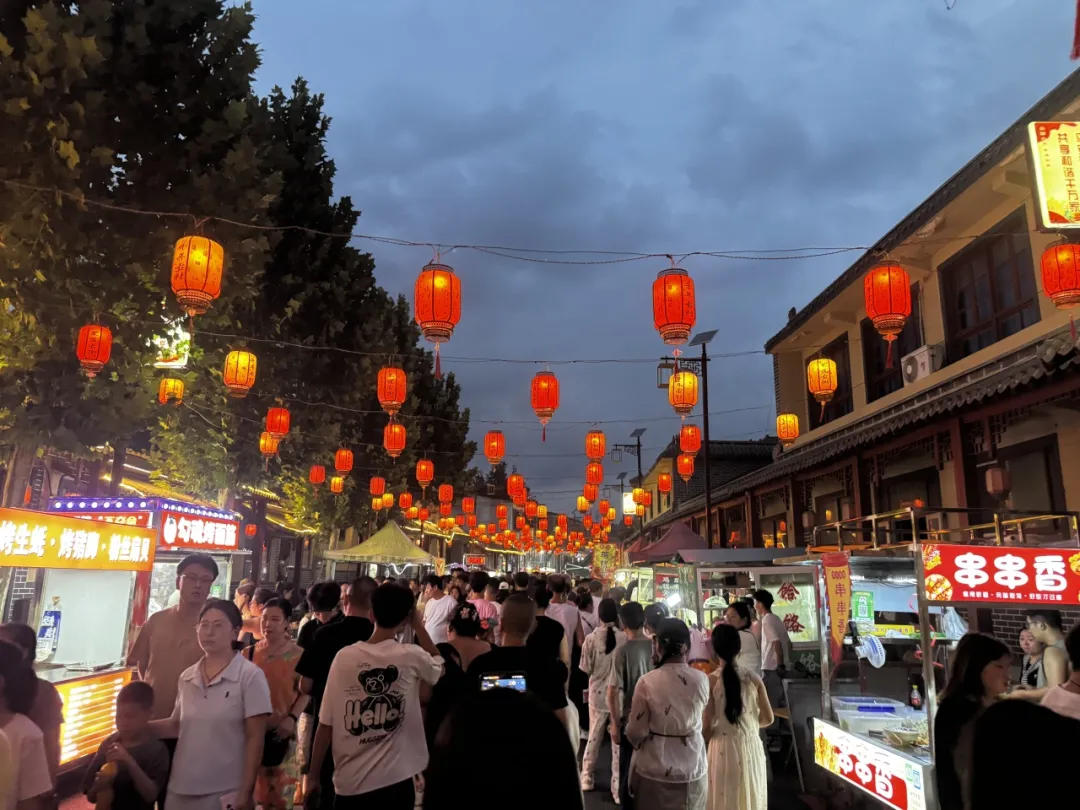 皋落古街人声鼎沸,节日氛围浓厚,各种美食如羊肉串、鱼、生蚝、小龙虾和羊肉泡馍等吸引着食客们。